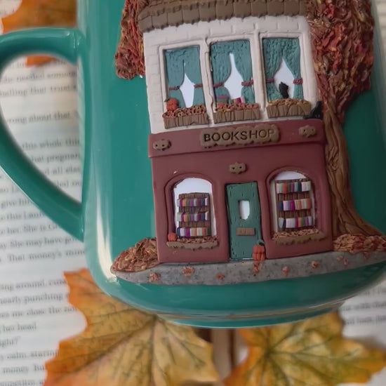 This handmade polymer clay mug brings the warm, cozy vibes of fall to your morning coffee or tea. The design captures a charming autumn bookshop scene with:
