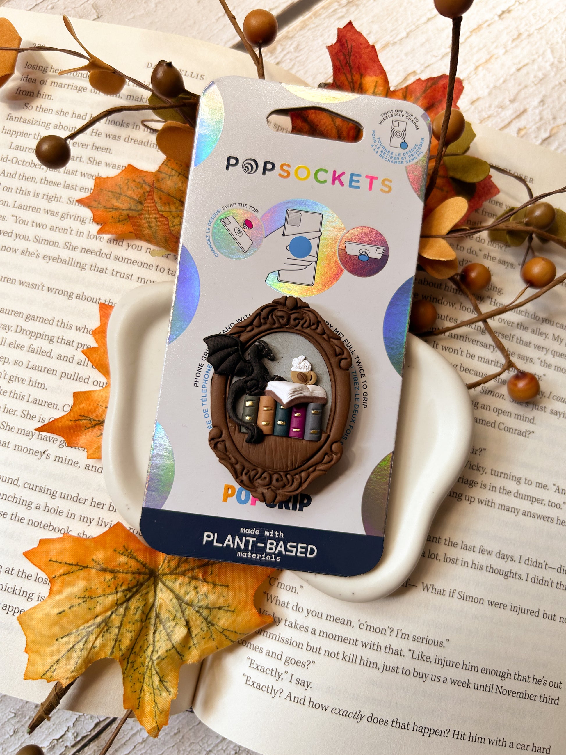 Step into the world of cozy fantasy with this handmade polymer clay swappable phone grip featuring a little dragon perched on a stack of books, completely immersed in his latest read. This unique grip is perfect for holding your phone, Kindle, or tablet more comfortably, propping it up while you read, or adding a touch of whimsy to your device.