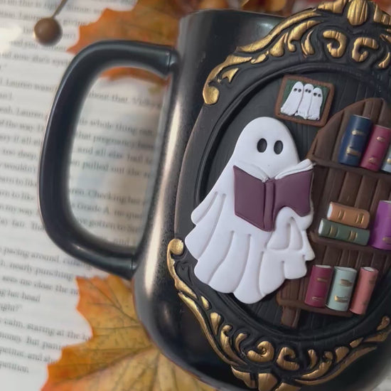 This handmade polymer clay mug is full of charm and personality! The design tells a story of a sweet little ghost enjoying a book, complete with: