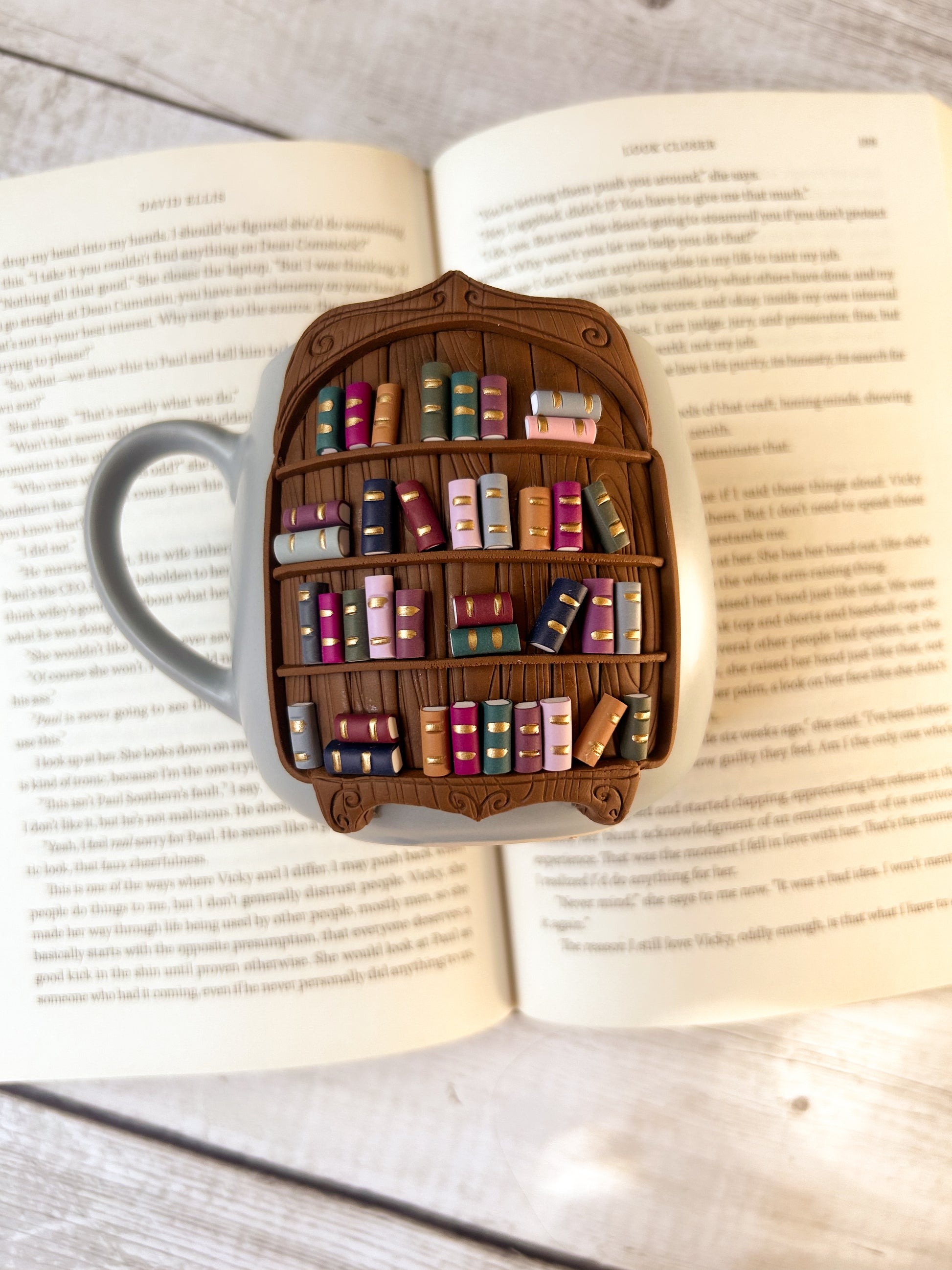 Say hello to the Cozy Library Mug, a handcrafted mug featuring a fully sculpted miniature bookshelf made entirely out of clay. Every tiny book, spine detail, and wood texture is individually shaped by hand, just carefully blended clay colors for a realistic and charming finish.